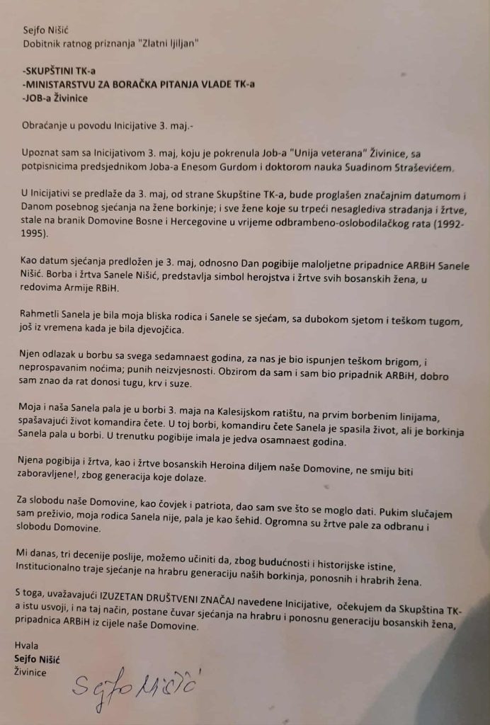 -Upoznat sam sa Inicijativom 3. maj, koju je pokrenula Job-a “Unija veterana” Živinice, sa potpisnicima predsjednikom Joba-a Enesom Gurdom i doktorom nauka Suadinom Straševićem. U Inicijativi se predlaže da 3. maj, od strane Skupštine TK-a, bude proglašen značajnim datumom i Danom posebnog sjećanja na žene borkinje; i sve žene koje su trpeći nesaglediva stradanja i žrtve, stale na branik Domovine Bosne i Hercegovine u vrijeme odbrambeno-oslobodilačkog rata (1992-1995). Kao datum sjećanja predložen je 3. maj, odnosno Dan pogibije maloljetne pripadnice ARBiH Sanele Nišić. Borba i žrtva Sanele Nišić, predstavlja simbol herojstva i žrtve svih bosanskih žena, u redovima Armije RBiH. Rahmetli Sanela je bila moja bliska rodica i Sanele se sjećam, sa dubokom sjetom i teškom tugom, još iz vremena kada je bila djevojčica. Njen odlazak u borbu sa svega sedamnaest godina, za nas je bio ispunjen teškom brigom, i neprospavanim noćima; punih neizvjesnosti. Obzirom da sam i sam bio pripadnik ARBiH, dobro sam znao da rat donosi tugu, krv i suze. Moja i naša Sanela pala je u borbi 3. maja na Kalesijskom ratištu, na prvim borbenim linijama, spašavajući život komandira čete. U toj borbi, komandiru čete Sanela je spasila život, ali je borkinja Sanela pala u borbi. U trenutku pogibije imala je jedva osamnaest godina. Njena pogibija i žrtva, kao i žrtve bosanskih Heroina diljem naše Domovine, ne smiju biti zaboravljene!, zbog generacija koje dolaze. Za slobodu naše Domovine, kao čovjek i patriota, dao sam sve što se moglo dati. Pukim slučajem sam preživio, moja rodica Sanela nije, pala je kao šehid. Ogromna su žrtve pale za odbranu i slobodu Domovine. Mi danas, tri decenije poslije, možemo učiniti da, zbog budućnosti i historijske istine, Institucionalno traje sjećanje na hrabru generaciju naših borkinja, ponosnih i hrabrih žena. S toga, uvažavajući izuzetan društvani značaj navedene Inicijative, očekujem da Skupština TK-a istu usvoji, i na taj način, postane čuvar sjećanja na hrabru i ponosnu generaciju bosanskih žena, pripadnica ARBiH iz cijele naše Domovine-, naveo je Sejfo Nišić.