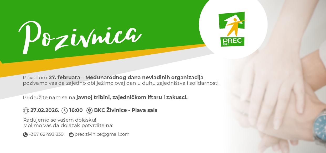 Udruženje Porodični Ruralni Edukativni Centar-PREC Živinice povodom 27. februara – Svjetskog dana nevladinih organizacija (World NGO day) organizuje javnu tribinu pod nazivom “NVO sektor u BiH 2026: stanje, izazovi, partnerstva”.