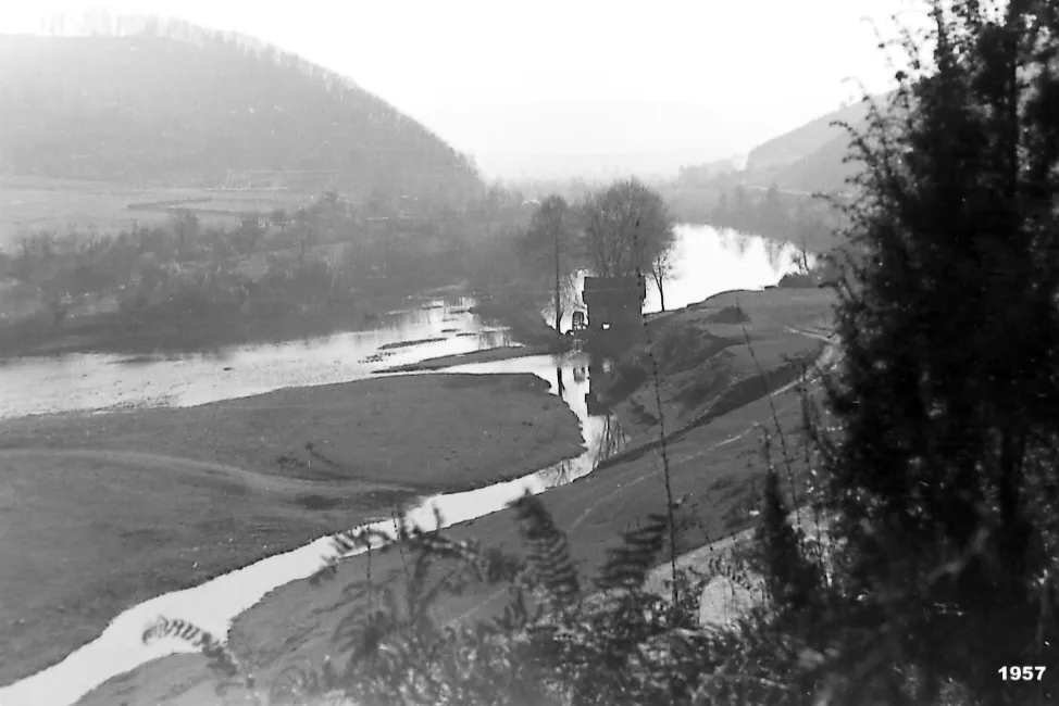 Fotografija iz 1957. Lokacija dovišta na Modracu. Dovište se nalazilo u dijelu ispod današnje brane u Modracu; okruženo rijekom i rukavcima Spreče. Izvor: Edin Begić: Lukavac kroz vrijeme.