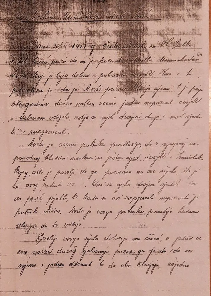 “Dana 30. 9. 1955. Č. Meho sin h. Salke, pričao da mu je poznat rahmetli M. Avdo koji je bio dobar i pobožan čovjek, kao i to poznato mu je da je Avdo pričao, da je njem, tj. prije 50 godina, došao nakon večere jedan nepoznat čovjek u zelenom odijelu, gdje su njih dvojica dugo u noć sjedili i razgovarali. Avdo je ovom putniku predložio da u njegovoj neposrednoj blizini nalazi se jedan sijed čovjek iz komšiluka, kojeg ako je po volji, da ga pozovemo na ovo sijelo, što je ovaj putnik odbio. Oni su, njih dvojica sjedili sve do prvih pijetlova, tek kad su ovi zapjevali nepoznati je putnik otišao. Avdo je ovoga nepoznatog putnika ponudio hranom ali je on to odbio.