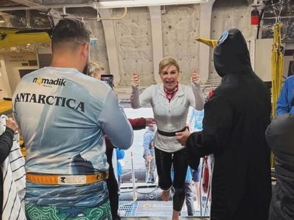 Na internetu je osvanuo još jedan video skoka bivše hrvatske predsjednice Kolinde Grabar-Kitarović u hladno more na Antarktici. Novi snimak objavio je influencer Kristijan Iličić na TikToku.